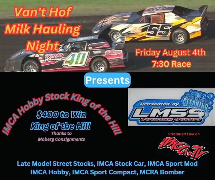 Join us this Friday night for Van't Hof Milk Hauling night. Mike and Stacie have sponsoring a night at the track for 9 years. We greatly appreciate their continued support of the sport we love! Come and thank them for all they do for us!